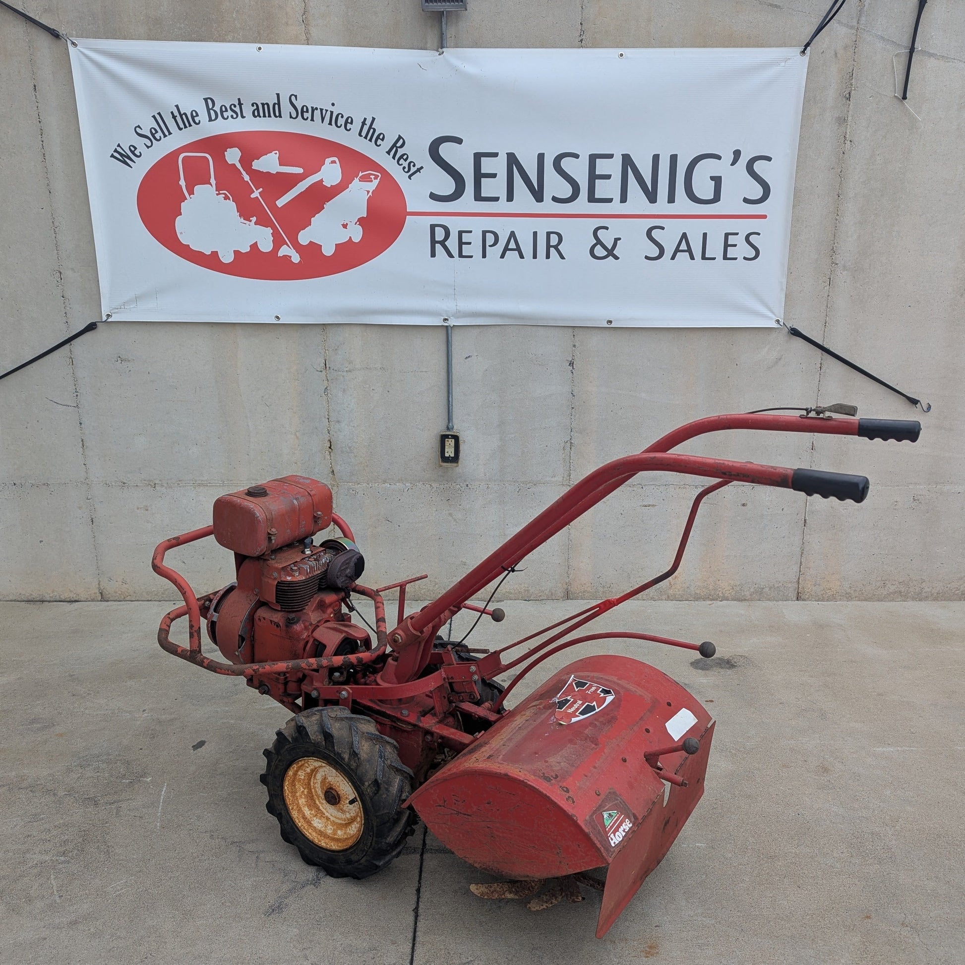 Troybilt Horse Tiller with 7hp Cast Iron Kohler engine. Serviced and ready for work. Tines are in good shape, one new tire, engine starts right up and runs great. It does burn a little bit of oil, but keep up with the oil level and it will run for many years.